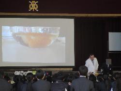 本日5,6校時に、サイエンス・トライやる事業で、アース製薬株式会社研究開発部の方にお越しいただき、2年生にご講演いただきました。企業研究の専門の方に実演・参加形式でお話しいただき、クイズもあり楽しく学んでいました。