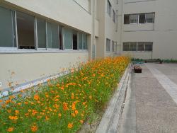 園芸ボランティアの皆様は学校中の花の手入れをしてくださったり草抜きをしてくださっています。中庭には、キバナコスモスがきれいに咲いています。