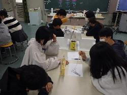 理科室をのぞいてみると、6年生が実験中。黒板には「炭酸水には何が溶けているのだろう」と書いてありました。各テーブルを見ると、水が入ったペットボトルが1つ。そのペットボトルに二酸化炭素を入れて振ると・・・・