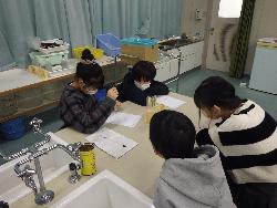 理科室では,6年生が実験中。今日の実験は、リトマス紙を使って水溶液の仲間分けをしようというものでした。青いリトマス紙が赤になると→酸性、赤いリトマス紙が青になるとアルカリ性、色が変わらなければ中性でしたね。子ども達はガラス棒の先に液をつけ、慎重にリトマス紙に落として色の変わり方を観察していましたよ。