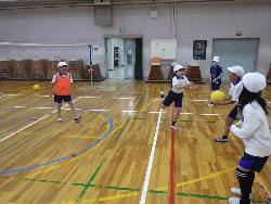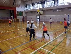 さて、体育館をのぞいてみると3年生が体育の学習中。やっていたのは、「バウンスバレーボール」。通常のバレーボールはボールが床につかないようにレシーブをしたり、トスを上げたりしますが、これがなかなか難しい。この「バウンスバレーボール」は、サーブは打つものの、両手でキャッチ。さらに、セッターにボールを投げて渡し、セッターは床にボールをバウンドさせて、他の仲間がアタックして相手のコートに入れるというもの。3年生の子ども達は1,2の3で相手コートに返すこのゲームに熱中していましたよ。