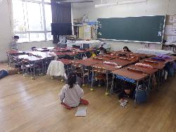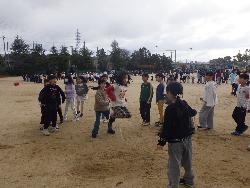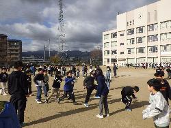 先週はかなり寒かったのですが、今日は陽射しもおだやかで暖かかったです。運動場では、3年生がクラス対抗ハンドボール大会をしていました。パス、そしてシュートをするのですが、ゴールが設置されているのではなく、机上に置かれたペットボトルにボールを当てて下に落ちたペットボトルの本数で得点が決まるというルールでした。全員攻撃、全員守備。みんな必死にボールを追いかけていましたよ。