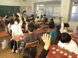 一方4年生の教室では「百人一首」。五色百人一首といって、20枚ずつに分けて二人で札を取り合います。上の句だけ聞いて分かる人、まだまだ練習中の人、それぞれですが、よく集中していました。きっと上達しますよ、がんばって!