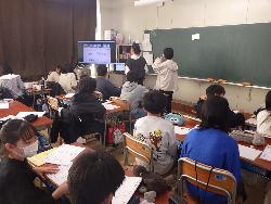 一方3年生の教室では社会の学習中。「消防士以外でまちを守る人」というテーマで学習していました。子ども達が取り上げていたのは、「警察官」。そこで、「警察官」に対するイメージを聞くと、「手帳」「24時間働く」「犯罪をとめる」とか「青い服」というのもありました。さて、どんなことをしてまちの平和を守ってくれているのかしっかりと勉強していきましょう。