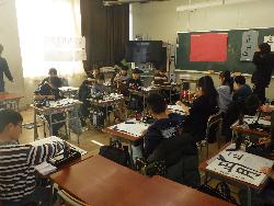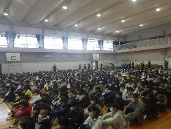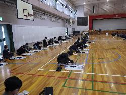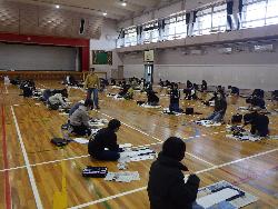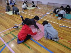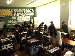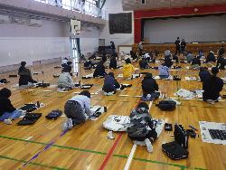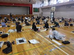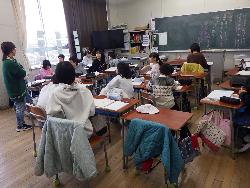 書き初め2です。4年生は教室で書き初めをしていました。題字は4種類。学年付きの先生も含め4人の担任が書いたものがお手本で、学年の廊下に掲示されていました。また、6年生は体育館で行っていました。真冬の体育館ですが、暖房が効いているので手がかじかむことなく落ち着いて取り組んでいました。
