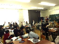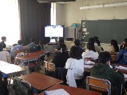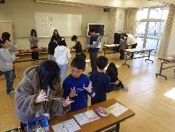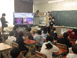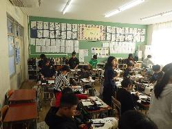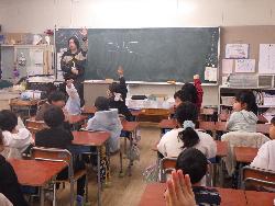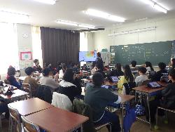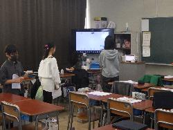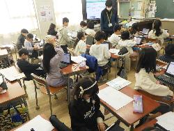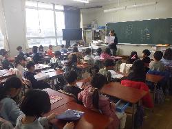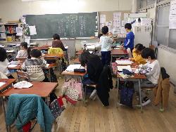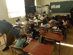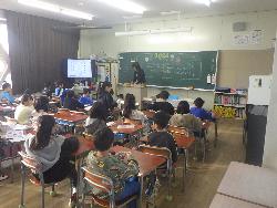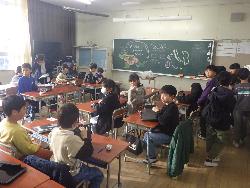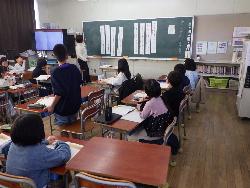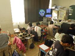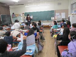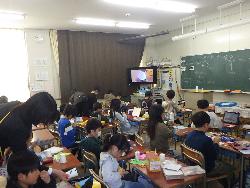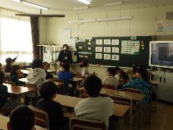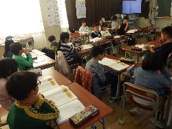 続いて外国語ルームをのぞいてみるt、4年生が「外国語活動」の学習中。「What'time is it?」ということで、就寝時間についてどう表現するのか学習していました。9時に寝る人は「It's 9p.m」とか「It's 10p.m」など。ちなみに夜の12時に寝ます、となると「It's 12a.m」となります。さて、みなさんは何時に寝ていますか?