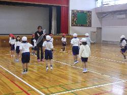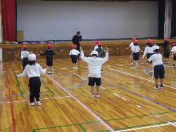 体育館をのぞいてみると、1年生がなわとびの学習をしていました。今日のテーマにしていたのは、リズムよく跳ぶということ。高くジャンプすると様々な技に対応することが難しくなってきます。そこで、リズムを重視して低く跳ぶということで、指導者の手拍子の裏で床に着地する練習をしてました。「パン ダン パン ダン・・・」こんなイメージです。