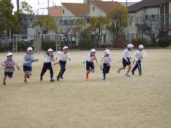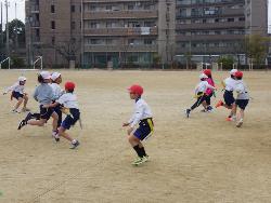 そして3年生は体育、「タグラグビー」。ラグビーとの違いは、タックルをしないかわりに腰につけた2本のタグ(リボン)をとること。タグをとられたら攻撃はおしまい。だから、攻撃側はタグを取られないように、守備側はタグを取ることを目指して走ります。運動場は寒かったのですが、子ども達は元気に走り回っていました。