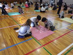 6校時 体育館から聞こえてきました。「有馬山~ 猪名のささ原 風吹けば~ はいっ!」今日は4年生の百人一首大会。体育館は大会会場です。上の句が読まれるやいなや 「はいっ!!」。さすが学習の成果がしっかりとあらわれています。