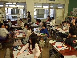 1年生の教室をのぞいてみると、国語の学習中。テーマは「もののなまえ」です。物にはそれぞれ名前があり、さらに同じ種類の物を集めた名前がある。「りんご」、「バナナ」、「ぶどう」はくだものです。「まぐろ」、「さば」、「あじ」はさかなです。そのほかにも様々な名前を出し合い、どんなグループになるのか考えていました。