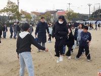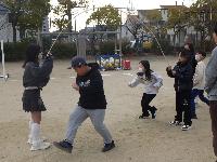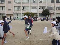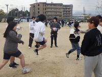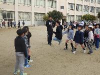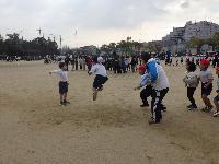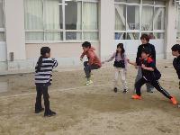 運動場をのぞいてみると、3年生が体育の学習中。横一列に並んで、楕円形のボールを隣の人に渡す練習をしていました。やっていたのは、タグラグビーです。これまでの練習をいかし、今日は練習試合の予定です。攻撃側は、ボールは後ろ方向に落とさないでパスすること、タグをとられないように前に進むこと。守備側は、相手の前進を阻止するべく、腰につけられたタグをとること。今日が初めての試合だったようですが、うまく進めることができたかな?