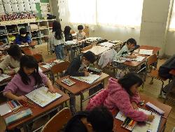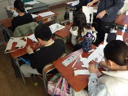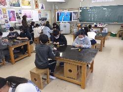 図工室をのぞいてみると6年生が切り出しナイフを使って角材を削っていました。「お箸」づくりです。切り出しナイフを握った手ではなく、もう片方の親指で優しく押し出すというのがなかなか難しい。でも、こつをつかむと順調に削っていましたよ。