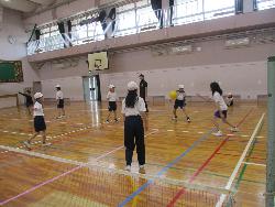 4年生の体育で行っています。プレルボールは、こぶしまたは前腕を使い、自陣にワンバウンドさせて味方にパスをしたり、相手が捕りにくいボールを打ち返したりして、得点を競い合う楽しいネット型のゲームです。柔らかくてよく弾むボールを使用すると、ボールの落下地点に移動したり、ボールを操作したりすることが易しくなります。今日はその1回目。ボールを操ることに苦戦していました。