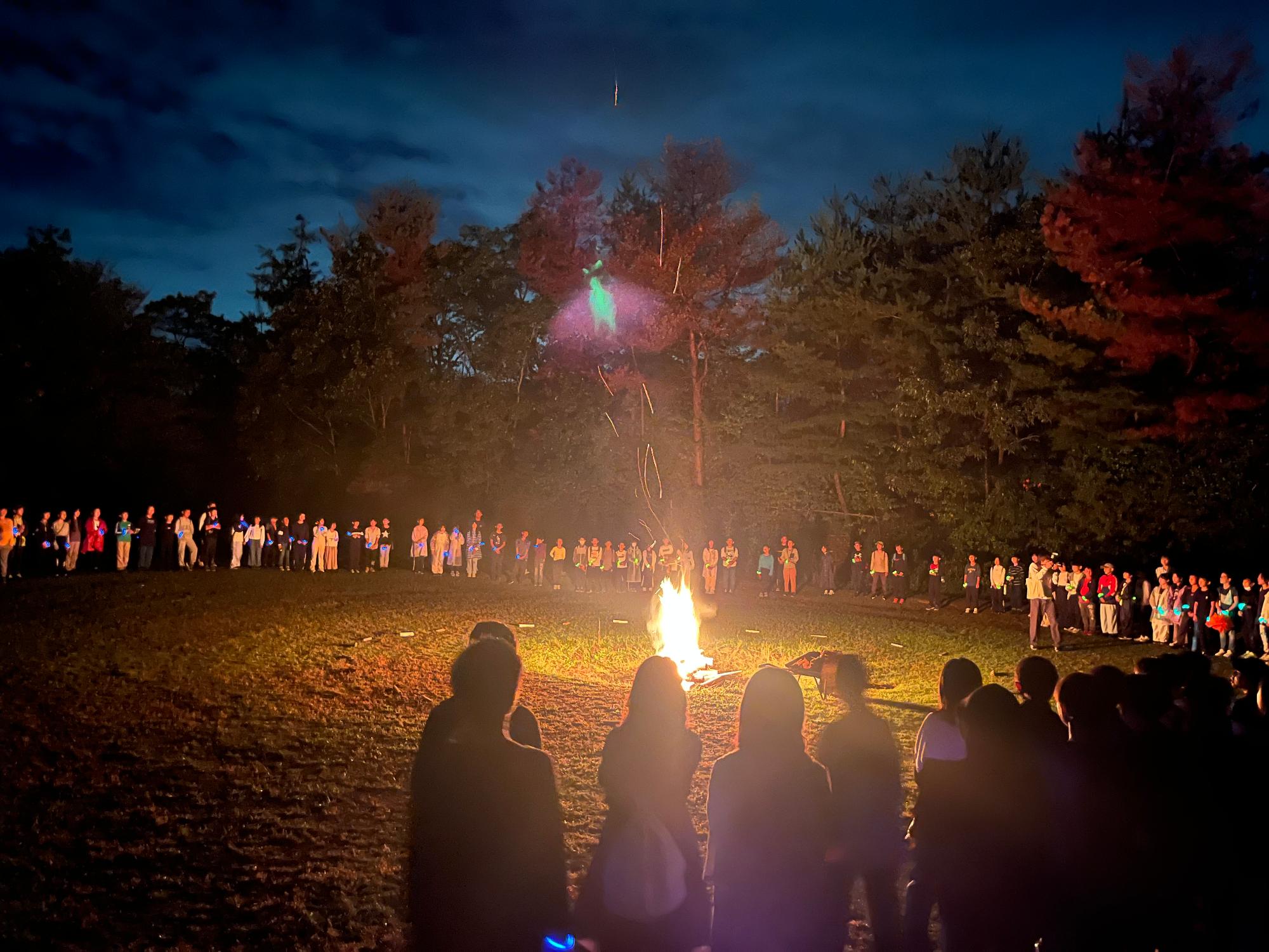4日目のキャンプファイヤーの直前には、大雨が降りましたが、その後なんとか持ち直し、無事に外で行うことができました。