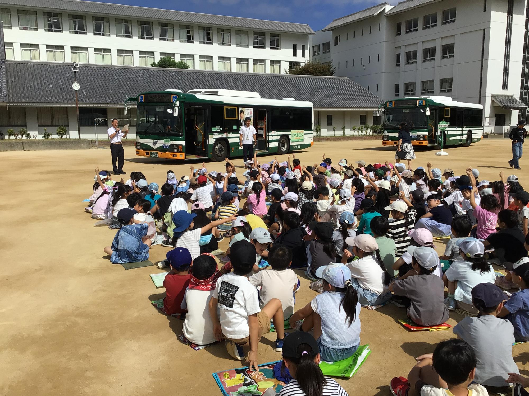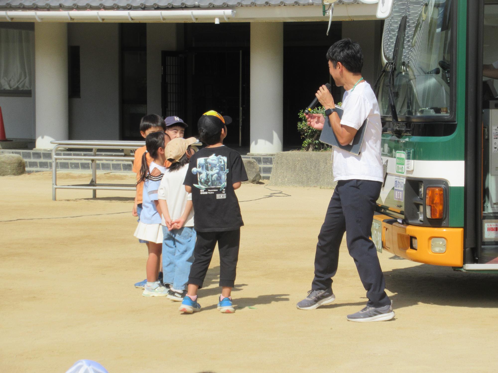1年生のみんなは、バスのクイズに挑戦したり、乗車マナーを学んだりしてバスについて詳しく知ることができました。さらには、バスに実際に乗って運賃を入れたり、降車ボタンを押したりする体験をしました。乗車体験の際は、グラウンドを一周しました。