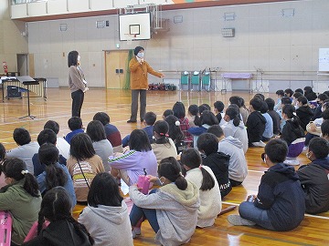 想咲(そうさく)太鼓打ちの溝端健太さんをお招きして和太鼓鑑賞会を実施しました。太鼓の音に聞き入る子どもや大きな太鼓の音に驚く子どもなど、迫力のある演奏を聴かせていただきました。途中には、本校の校歌を織り交ぜた演奏や子どもたちが太鼓をたたく体験コーナーもありました。最後は、太鼓の演奏に合わせて、子どもたちが手拍子で参加するなど、太鼓の演奏と会場の子どもたちが一つになって大盛り上がりになりました。寒さも吹っ飛ぶほどに、心があたたかくなるとても楽しいひとときを過ごすことができました。
