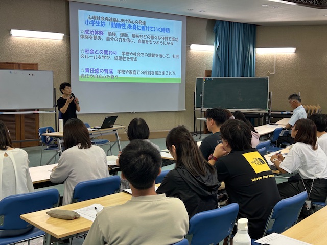 午後は大阪大谷大学・今宮教授にお越しいただき、校内研究についての研修会を行いました。前半は本校で毎学期取り組んでいる「学級力アンケート」の1学期の分析、教員一人ひとりの個人目標の見直しをしてから、今宮教授にご講話いただきました。後半は各学年に分かれて、これから取り組む単元の教材研究に取り組みました。