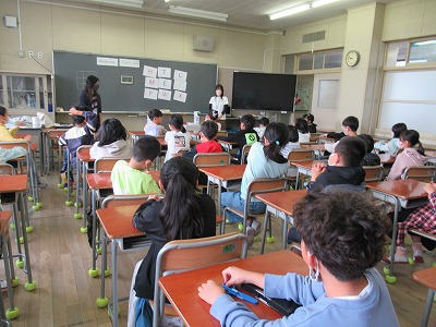 4年生は今年度はじめての外国語活動の時間です。先生もかわってまずは、先生への質問タイムから始まりました。もちろん英語です。その後は楽しくアルファベットのカードを画面を見ながら並べていました。