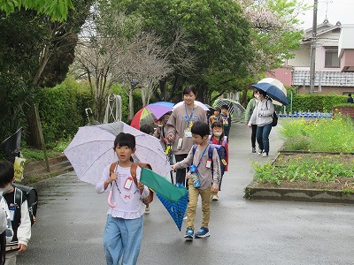 1年生は、11日 月 から先生が同じ方向に帰る子どもたちのグループにつき、歩道の歩き方、交差点の渡り方など指導を行っています。今日は心配していた雨も小雨になってよかったです。