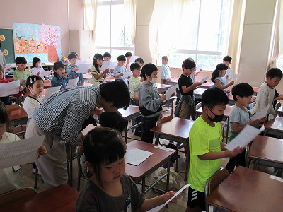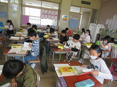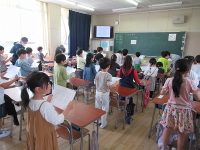 1組と2組から国語で学習している「ふきのとう」の音読が聞こえてきました。みんなで順番に読んだり一人一人読んだりと、「ふきのとう」の登場人物の気持ちを考えて音読を楽しんでいました。聞いている子たちからは「上手だったね」と拍手をもらっていました。