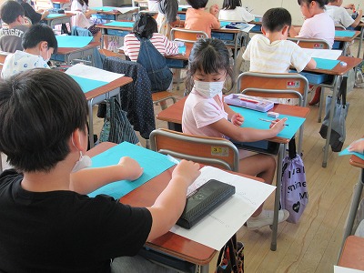 1年生は、鉛筆の正しい持ち方を学習していました。そして、きちんとした持ち方で線をなぞって練習していました。家庭で学習するときにも正しい持ち方をして書くようにしましょうね。