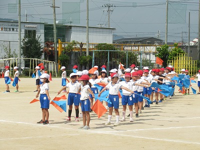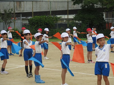 2年生の体育大会に向けての練習です。一番の見せ場、旗でウェーブを作ります。上手にカウントをとりながら見事なウェーブを作ることができました。素晴らしい練習の成果が出ています。