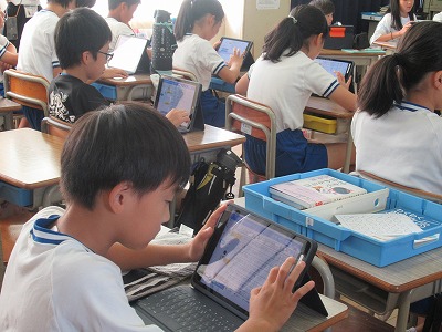 国語の「たのしいな ことばあそび」学習です。プリントにたくさん言葉を見つけることができました。集めた言葉を、今日は6年生に使い方を教えてもらったタブレットに文字を打ち込んでいました。