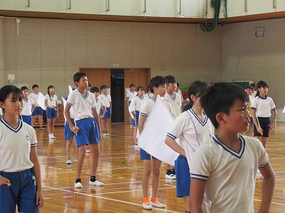 6年生の体育大会に向けての練習です。今日は、体育館で旗の振り方や降ろし方等、細かい動きの調整です。旗の動きがそろうと格好よくなります。下級生に格好のいい演技を見せてください。