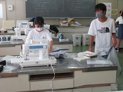 6年生が家庭科の学習でミシンを使って「エコバッグ」を製作していました。布を裏返し「わき」と「底」の部分を縫うために、印をつけていました。できあがりが楽しみですね。