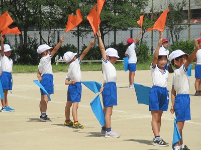 2年生の体育大会に向けての練習も最終日になりました。繰り返し繰り返し何度も練習を重ねてきました。今日は、オレンジと青の旗が音を立ててきれいに揃っていました。
