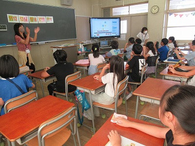 4年生の外国語活動の時間です。最初にアルファベットの読み方です。スピードを上げても発音ができるようになってきましたね。数字はどうでしょう?1~10までは大丈夫。11~20は難しいね。