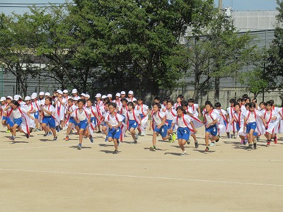 1,2年生合同で、学級全員リレーの練習です。それぞれの学年が走っているのを互いに見合って、声援を送っていました。2年生は1年生によい見本を見せることができましたね。