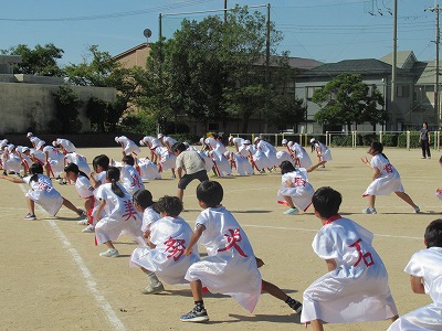 4年生の体育大会に向けての練習です。今日から練習も2週目となりました。前週の復習をしながら、新しい動きを覚えていました。今日も元気な声が響いていました。