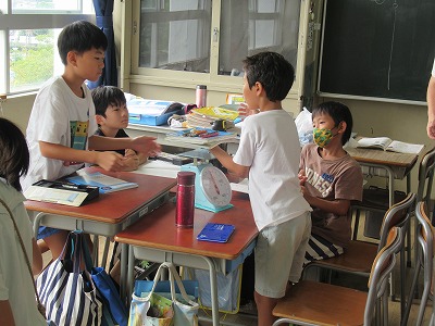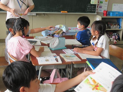 3年生は算数で「重さ」の学習を進めています。手作りてんびんをと1円玉を使って身近にあるいろいろなものの重さ比べをしていました。