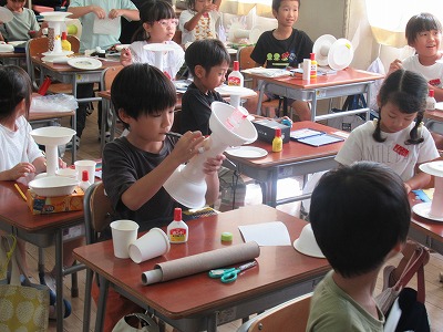 1年生が、紙皿や身近な材料を使って、転がるおもちゃ「コロコロ」を図工の授業で作っていました。紙皿に飾りをつけたり、模様を描いたりして、転がして模様の変化を楽しむことができました。