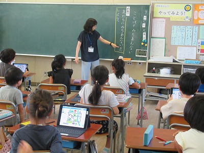 今日も、6年生が1年生の教室に出向き、タブレット端末の使い方を教えていました。スクールタクトを使って、絵を描いたり、写真を撮って画面に貼り付けたり、仮名入力で名前を書いたりと6年生がていねいに1年生に教えていました。