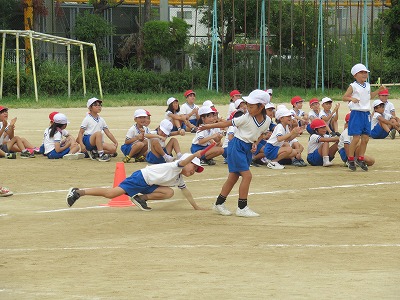 1年生の体育大会に向けての練習です。小学校では初めてのリレーです。入場の仕方やバトンの渡し方、退場の仕方など学習しました。リレーが始まると、自分のクラスの子に大きな声で声援を送っていました。