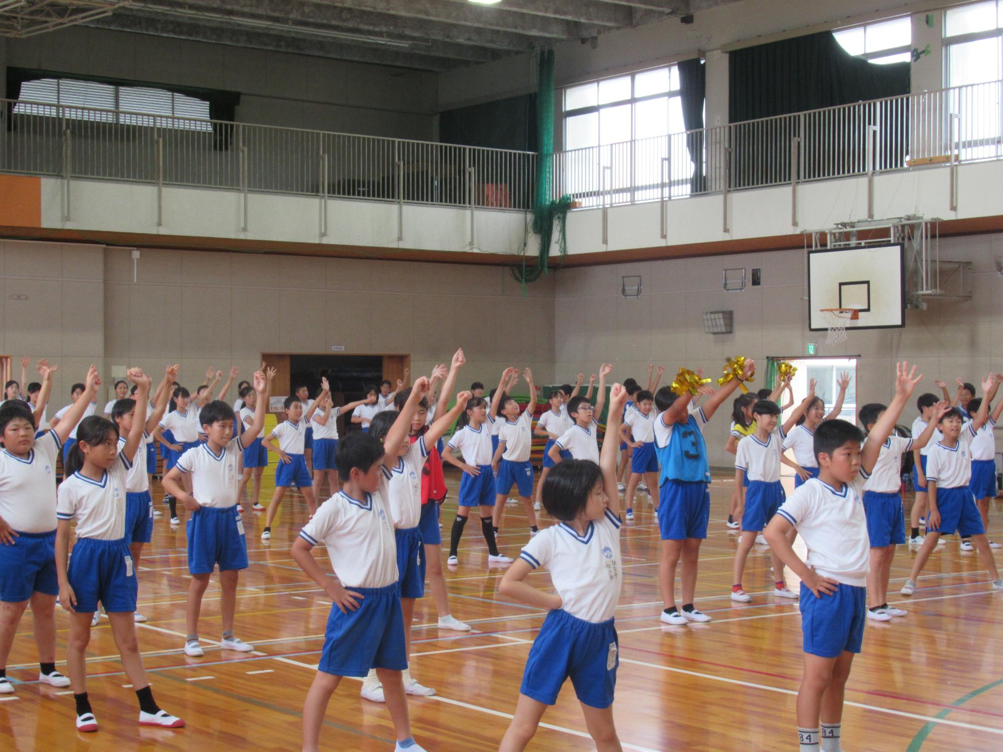 4年生の体育大会に向けての練習です。今日は、ダンスから学級全員リレーまで通して練習をしていました。エネルギーいっぱいの子どもたち、運動場に大きな声が響いていました。最後の決めのポーズも決まったね。