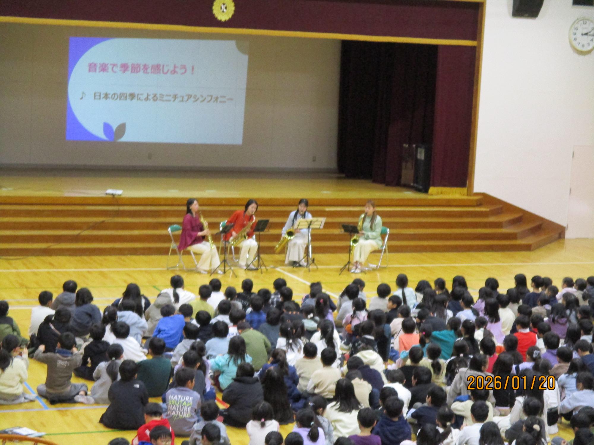 1/20(火曜)に,3・4年生向けに環境教育の一環としてウィンターコンサートがおこなわれました。教師による紙芝居の後,4名のサックス奏者の方々による演奏会がありました。日本の四季を感じる曲や,子どもたちがよく知る曲のイントロクイズなど,子どもたちは音楽に親しみながら日本の自然の素晴らしさを再確認しました。