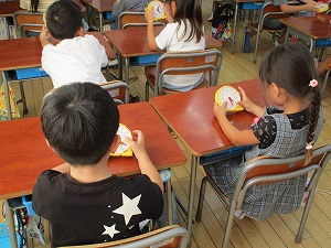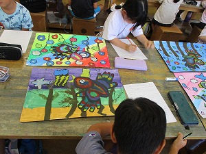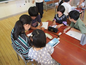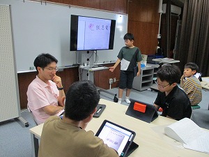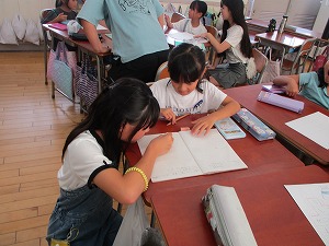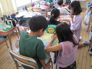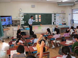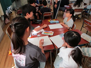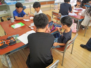 1年生の国語「はいくをつくろう」の先生は6年生。1年生の入学式で手をつないでくれた6年生が年間を通してサポートします。これまでも一緒に遊んでくれたり、掃除を手伝ってくれたりしました。今回は国語の授業で俳句にチャレンジしました。1年生から夏休みの思い出を聞き出します。季語を入れながら夏休みの状況がわかるように五七五にまとめます。一緒に思い出を話したり、padを使って絵の資料を探したりする姿を見ることができました。1年生もうれしかったようで笑顔あふれていました。