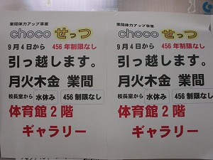 「ちょこせっつ2年目」(体力向上事業)の会員数が増えて、校長室が手狭だったこともあり、今年度から学年ごとに使用する日をわけました。それでも「毎日利用したい」という児童の声に応えて、昨日から体育館ギャラリーへ引っ越しました。今日は台風の影響で運動場が使用できず、50名ほどが集まりました。賑わいは、大阪万博に負けてません。体幹強化、体力向上のため取り組んでいきます。