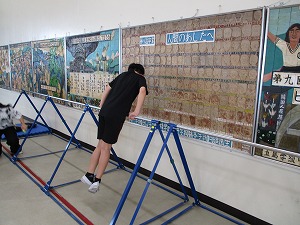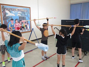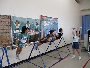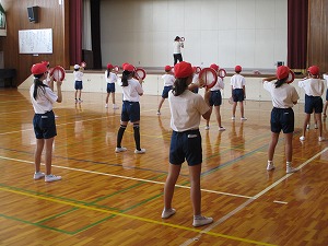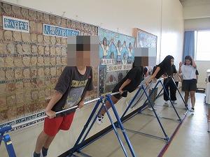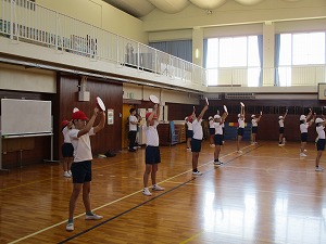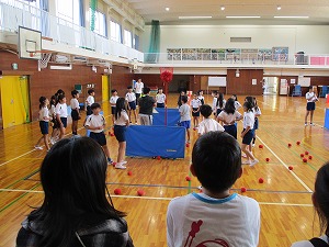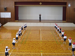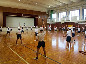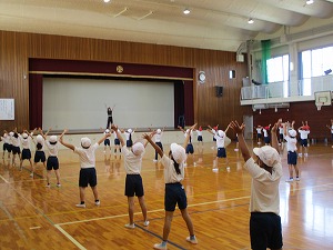 今日から体育大会特別時間割です。外は気温が高く「使用禁止」の暑さですが、体育館は空調設備もあり快適に授業を実施することができました。先生と動きを確認しながら踊っていました。あと1ヵ月完成が楽しみです。