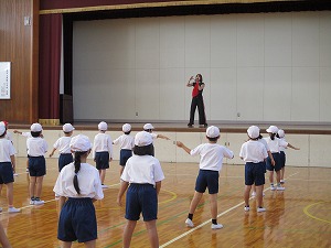 学校運営協議会から学校サポートボランティアとして卒業生である先輩から教わる貴重な機会をいただきました。担任の先生とダンスの先生とで振り付けを考え、実際の授業でも踊りを披露していただきました。たくさんダンスの先生に褒めていただいたので、自信をつけたようでした。