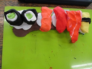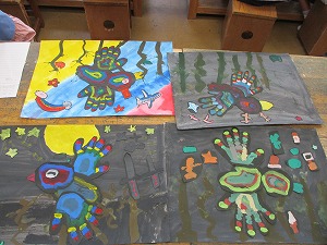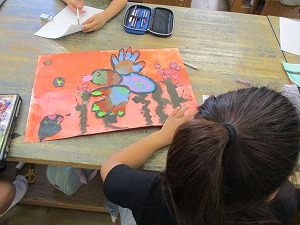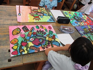 「ふしぎなとり」が完成間近です。もとになっているのは自分の手形です。2つ合わせることにより「とり」になり今にも羽ばたきそうです。