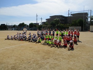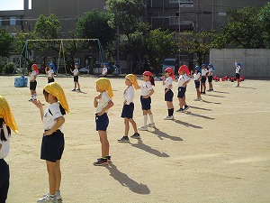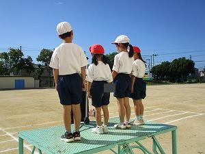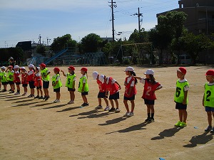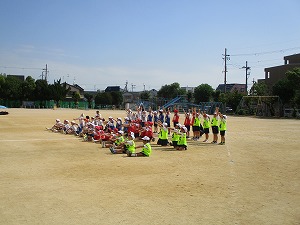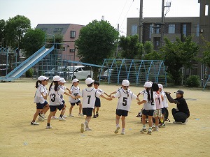 運動場での立ち位置が決まりました。体育館とは違い、動く範囲が広がりますが、片手を広げ友だちとの距離を確認しました。はじめは横を見て列をそろえることがむずかしかったようですが、何度か練習を重ねるうちに定位置に素早く移動できるようになってきました。