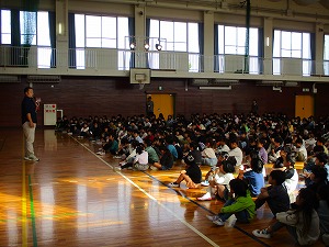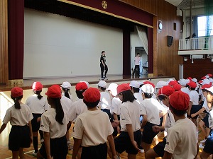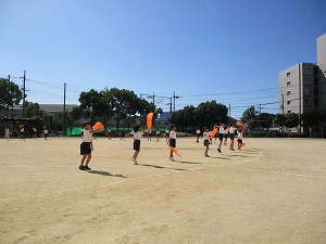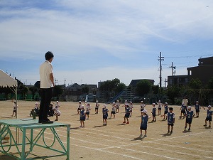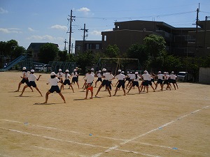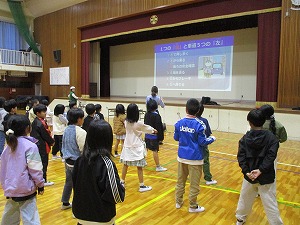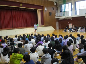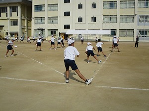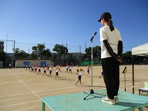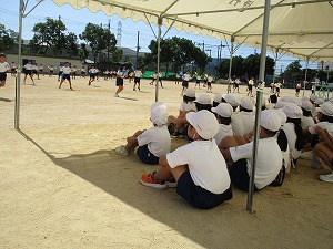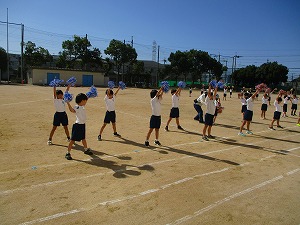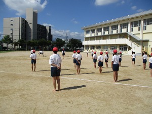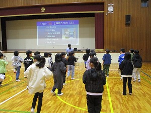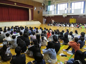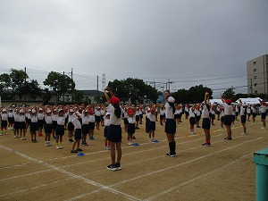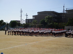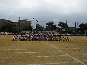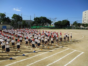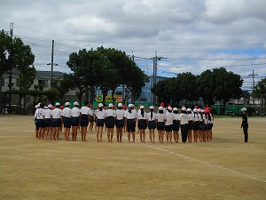 1回目の全校体育の学習風景です。8時45分には服装を整え、開始することができました。しっかり話が聞け、行進も列を揃えながら歩くことができました。