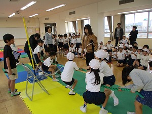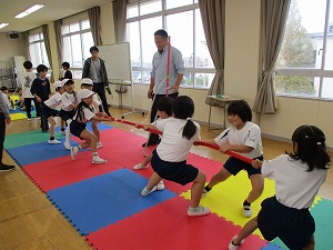 業間に体育委員会主催による綱引き大会を行いました。4人1組でチームを組みトーナメントの勝ち抜き戦です。今日は1年生の日。これから毎週2年生、3年生と展開していきます。1年生児童は綱を初めて握る子もいたようで、ルール説明を兼ねて先生と5年生体育委員4名のデモストレーションがありました。