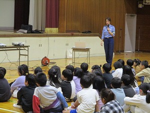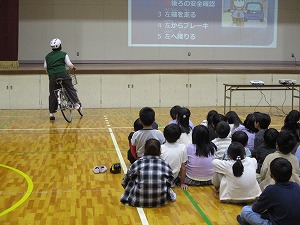 伊丹市交通安全課のおまわりさんを講師に迎え、自転車安全教室が開催されました。最近暗くなるのも早く伊丹市でも自転車事故が多いことから、正しく自分の命を守る学習として行いました。自転車に乗るときは「左」から乗る、「左」からブレーキかける、「左」から降りるなどルールがあります。今日の学習を忘れずに安全に生活してほしいと思いました。しっかり話が聞けていました。