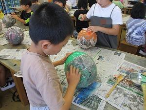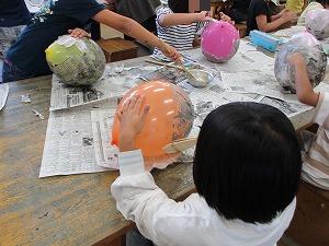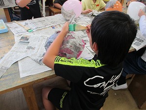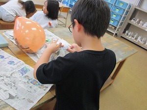 風船の上から洗濯のりを塗った新聞紙を貼り付けているところでした。たまごをつくるようです。どんなたまごができるのか楽しみです。作業中に風船がわれることがあり、慎重に作業を進めていました。