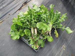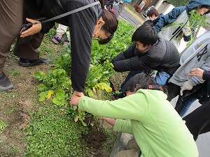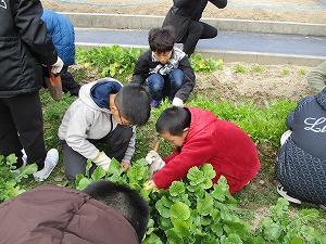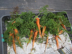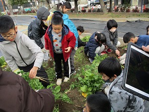 今日は学習室の小集団の様子です。にんじん、大根、水菜を収穫しました。にんじんは大きくなっていました。大根はスルッと抜けるくらい細く、水菜は豊作でした。友だちと協力しながら活動することができました。